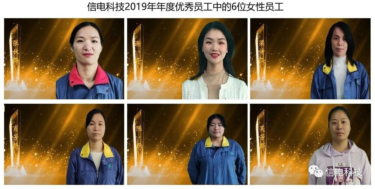 在被評為信電科技2019年年度10位優(yōu)秀員工中,女性員工占了6位,她們分別是:張秋梅(財(cái)務(wù)部)、謝丹(市場部)、梁詩儀(生產(chǎn)部)、肖芳艷(生產(chǎn)部)、陳秋(品質(zhì)部)和吳芳麗(倉庫)。