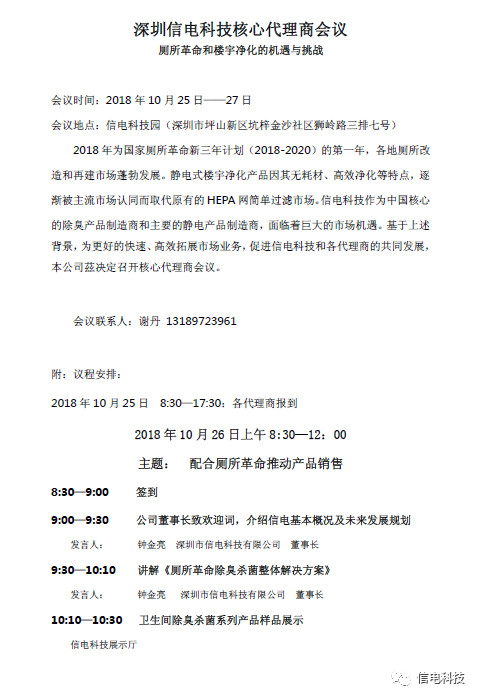 2018年10月,深圳,秋高氣爽。深圳信電科技隆重召開主題為“砥礪前行 抓住機(jī)遇”的2018信電科技核心代理商大會(huì),來(lái)自全國(guó)各地的核心代理商匯聚在信電科技園,對(duì)信電除臭殺菌機(jī)系列產(chǎn)品和樓宇中央空氣凈化系統(tǒng)的市場(chǎng)推廣進(jìn)行了熱烈的交流。