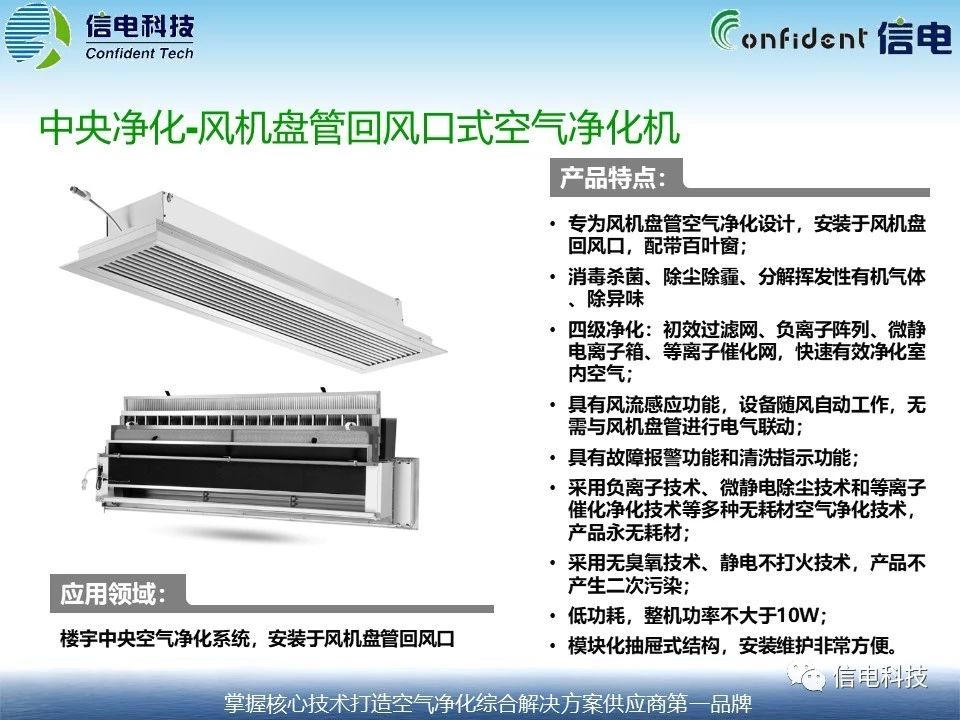 其中重點(diǎn)介紹了2018年開發(fā)成功的風(fēng)機(jī)盤管回風(fēng)口空氣凈化機(jī),該產(chǎn)品安裝和維護(hù)非常方便,無(wú)耗材設(shè)計(jì),除塵、殺菌和分解甲醛三合一。