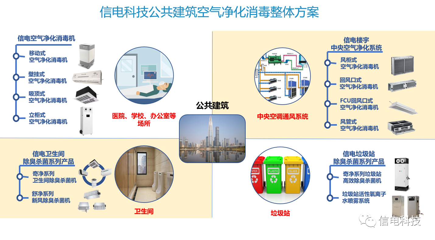 信電科技依托二十年空氣凈化消毒領(lǐng)域的經(jīng)驗(yàn),針對(duì)公共建筑推出了一整套完整的空氣凈化消毒方案,如下圖所示: