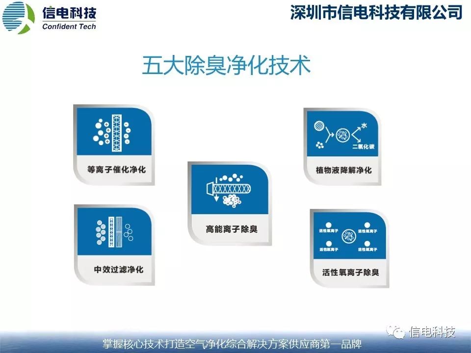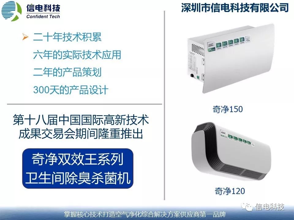 深圳市信電科技有限公司是一家致力于空氣凈化產(chǎn)品及配件的研發(fā)、生產(chǎn)和銷售的國家高新技術(shù)企業(yè),對除臭技術(shù)的研究和應(yīng)用長達(dá)十年。在2016年第十八屆中國國家高新技術(shù)交易博覽會上推出新一代奇凈雙效王系列公用衛(wèi)生間除臭殺菌機(jī),得到了社會和廣大客戶的認(rèn)可,采用高能離子除臭技術(shù)和等離子催化技術(shù)等五大核心除臭技術(shù),除臭和殺菌效率都大于95%,廣泛地應(yīng)用于各類廁所,包括:旅游廁所、醫(yī)院廁所、環(huán)衛(wèi)廁所、校園廁所以及交通廁所等等,完全能滿足高品質(zhì)廁所對空氣質(zhì)量的要求。