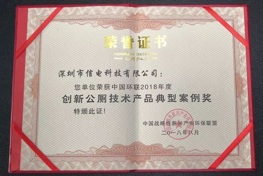 同時(shí)信電科技的公廁除臭殺菌系統(tǒng)被評(píng)為“2018年度創(chuàng)新公廁技術(shù)產(chǎn)品典型案例獎(jiǎng)”,感謝中國(guó)環(huán)聯(lián)給予的肯定和獎(jiǎng)勵(lì)。