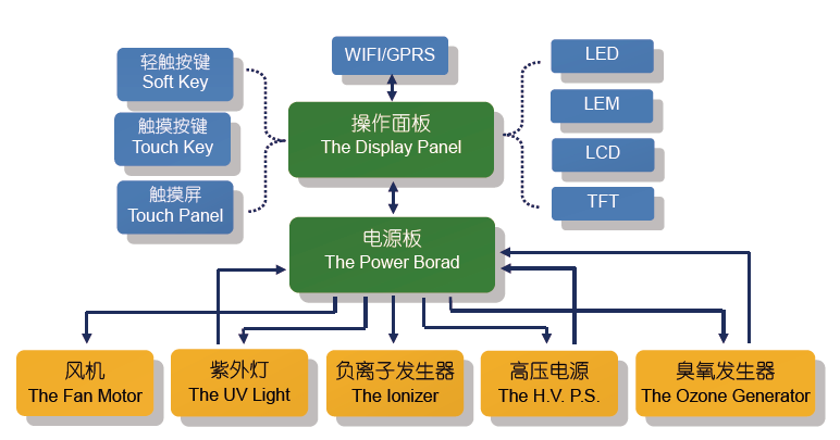 可控制高壓電源、負離子發(fā)生器、紫外燈管、凈化管或臭氧發(fā)生器等凈化部件