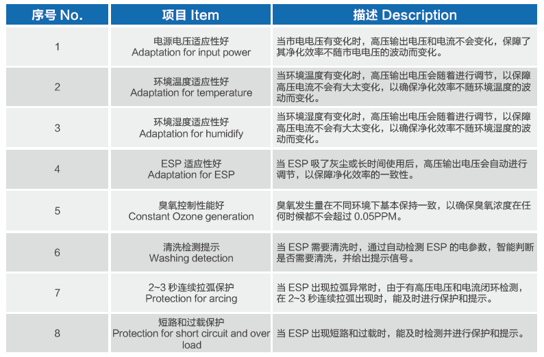 ◆ 環(huán)境適應(yīng)性:隨著環(huán)境溫度和濕度的變化自適應(yīng)調(diào)節(jié)輸出電壓,確保凈化效率的一致性;