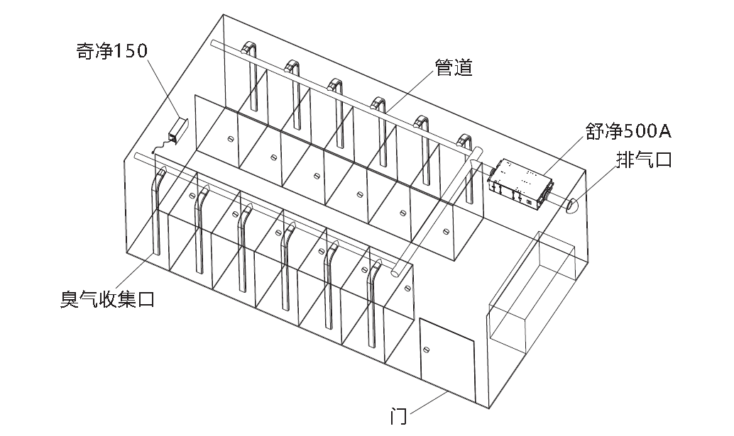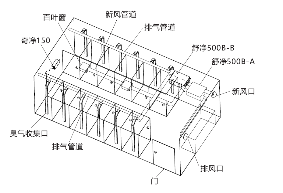 采用舒凈系列單向流新風除臭機+奇凈系列除臭殺菌機