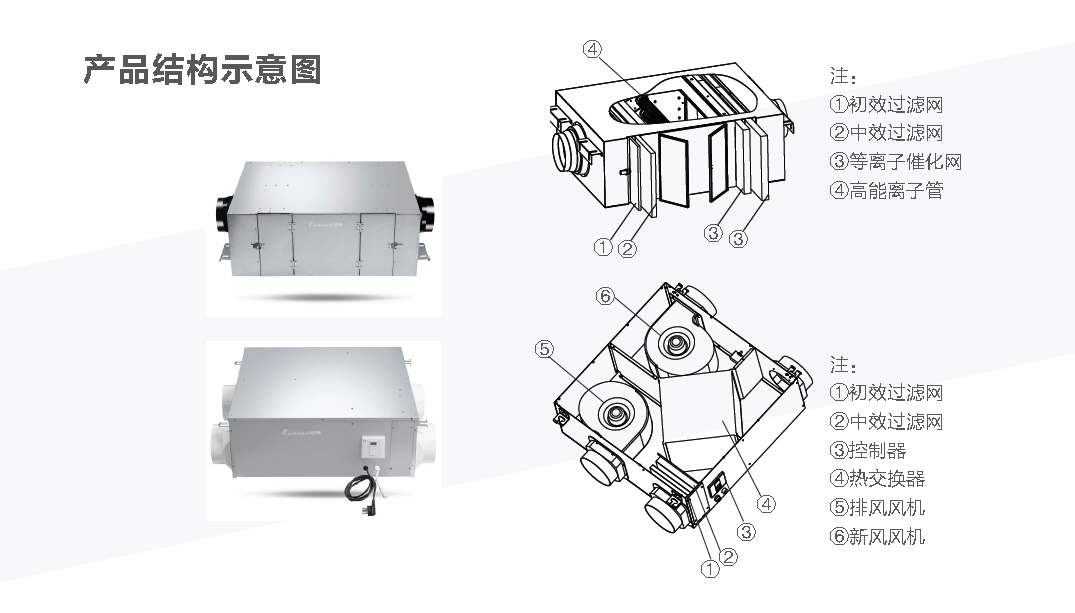 新風和廢氣通過熱交換器進行能量交換,以減少能耗,同時輔助空氣內(nèi)循環(huán)快速除臭殺菌
